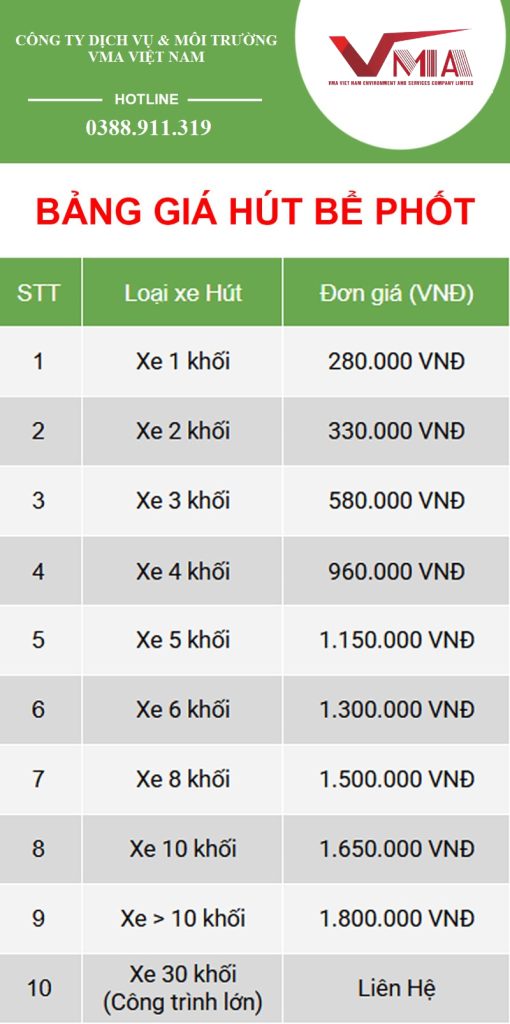 Dưới đây là bảng báo giá 1 lần hút bể phốt tại Môi Trường VMA cho khách hàng tham khảo: